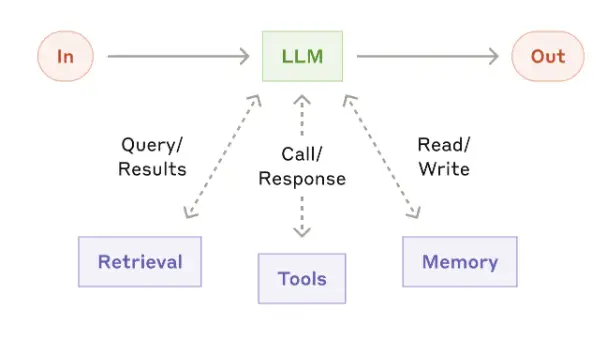Le modèle (LLM) est enrichi de quelques capacités supplémentaires – accès à une base de connaissances, à un outil de recherche, ou à une mémoire courte/longue durée. C’est le bloc de base qui sert à la plupart des systèmes : le modèle peut, par exemple, aller chercher des informations dans une base documentaire interne, puis composer sa réponse en y intégrant ces données.