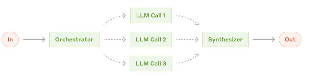 Un orchestrateur gère la répartition des sous-tâches et rassemble les résultats produits par chaque « worker », sans déterminer à l’avance le nombre exact d’étapes.